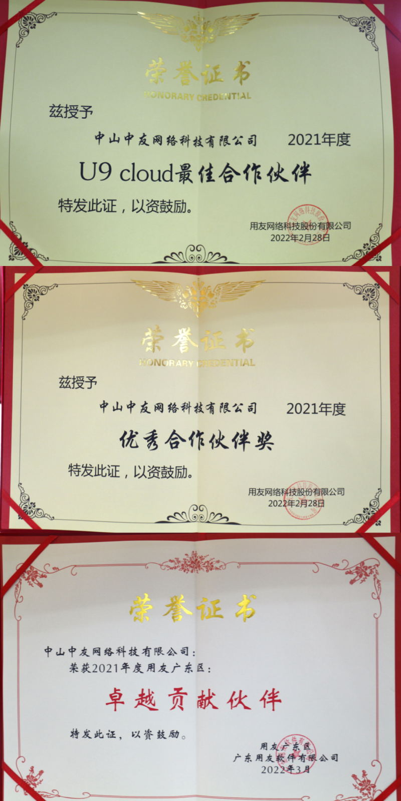 近日,中山中友网络科技有限公司荣获“用友U9 cloud最佳合作伙伴”,“2021年度优秀合作伙伴奖”,“用友广东区卓越贡献伙伴”,“畅捷通百万伙伴精英奖”和“畅捷通最佳云财税服务奖”荣誉称号。