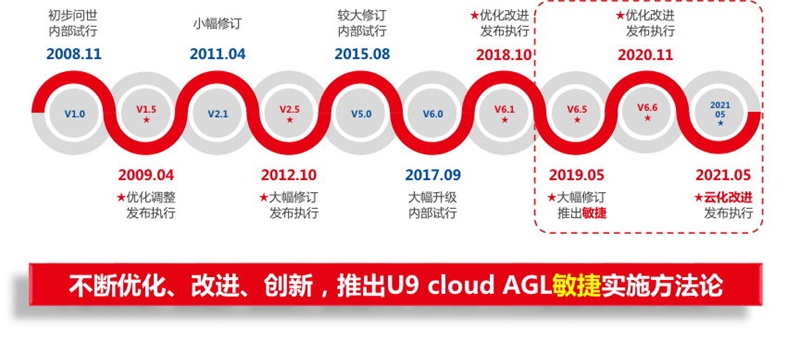 今年5月,用友再次对敏捷实施方法论进行了云化改进,并随着U9 cloud的正式落地发布执行。U9 cloud AGL(AGiLe)敏捷实施方法论的设计理念是以价值交付为导向,以客户满意为宗旨,通过价值营销、价值实施、价值运维,实现敏捷化、价值化、数字化、智能化,最终推动制造企业数智化转型。