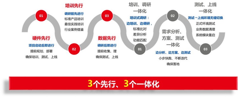 例如,在系统建设阶段,该方法论包含系统环境规划与部署、标准培训与差异分析、静态数据收集与整理、解决方案设计与测试、系统配置与数据准备、最终用户培训等关键环节,并形成了以方案设计、测试验证、差异分析为核心的完整闭环,从而不断的迭代改进。