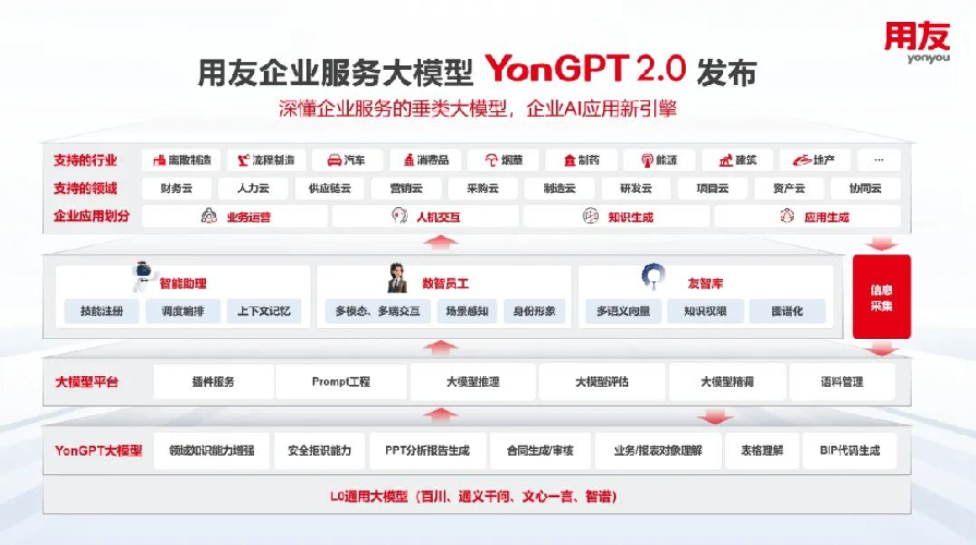作为用友BIP产品创新的重要方面,用友还打造了业界首个企业服务大模型YonGPT,拥有智能助理、智能知识运营、智能合同、智能订单生成、智能人才发现等100多个智能应用服务,使能企业智能运营。