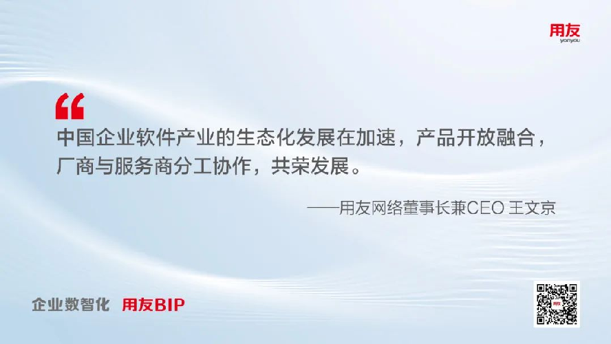 为此,用友率先提出了全球企业软件领域的中国概念— BIP(Business Innovation Platform,商业创新平台)。从信息化到数智化,从ERP到BIP,不仅是产品理念的创新,更是中国企业软件实现跨越式发展的里程碑。