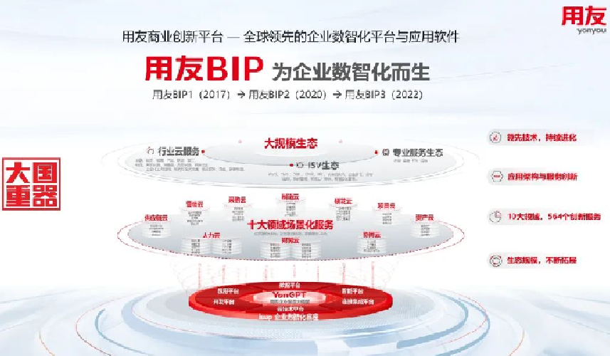 比如用友近年来战略投入研发,通过数年的持续攻坚,已率先完成了从信息化时代的ERP到数智化时代BIP的产品换代,推出了用友数智商业创新平台—用友BIP。用友BIP是全新一代的企业软件,是一个集PaaS平台、领域应用、行业应用与服务生态为一体的产品体系。
