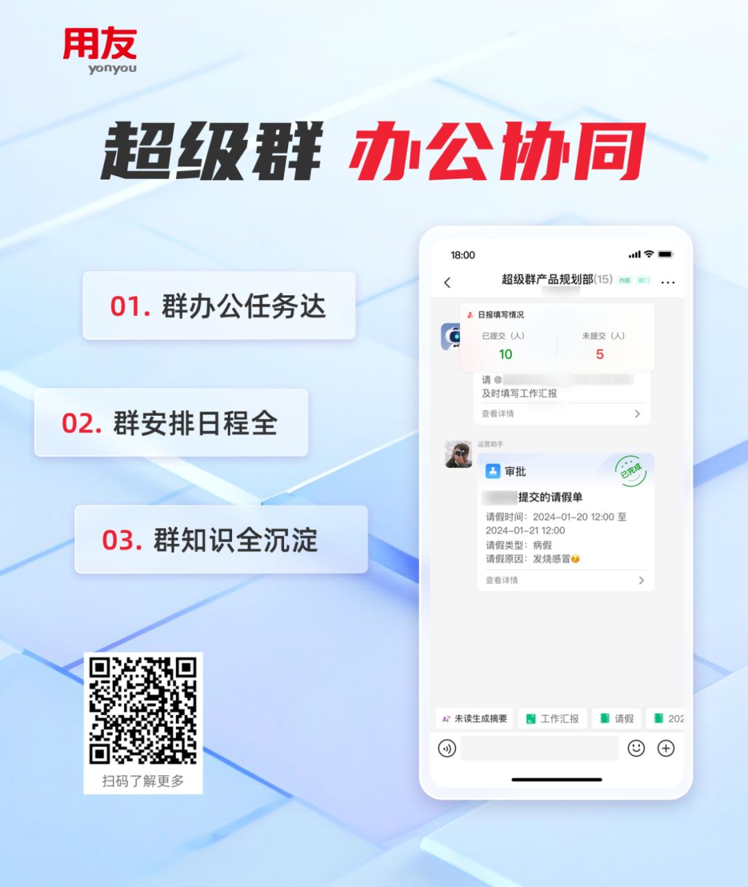 在快速变化的商业环境中,高效、灵活、全面的协同工作已成为企业提升竞争力的关键。用友友空间推出的全新“超级群”功能,正是为了满足现代企业对于更加智能化、集成化协同工作的需求。超级群不仅是一个沟通平台,更是一个集工作、财务、收付、数据、采购、销售、项目、办公于一体的全方位协同中心,旨在打破传统工作协同的界限,让协作更加顺畅,企业运营更加高效。