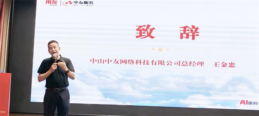中山中友网络科技有限公司总经理 王金忠在致辞中讲到,用友37年,中友20年,我们一路陪伴各位客户共同成长;从最开始的会计电算化、企业信信息化、数字化以及现在新的AI时代,我们将一如既往地,以强大的技术平台和专业的本地化服务,赋能客户高质量发展!