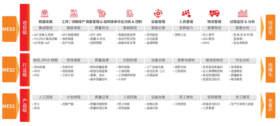 根据 60 万用户实践,我们规划出了如上图所示的智能工厂的具体场景,企业可以根据自己的数字化基础水平,选择自己的应用层次。基于 U8+ 系统平台,企业可以通过从 MES1 到 MES3 的分步建设路径,不断提升企业的现场管理能力,找到最适合自己的智能工厂升级路线图。